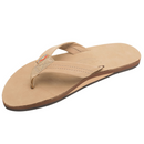 The single layer premier leather sandal is made with top grade nubuck leather; the top sole is embossed with the Rainbow® logo. The strap, also nubuck leather; is double stitched, and the nylon toe piece is secured with a box X stitch, all using bonded nylon thread.